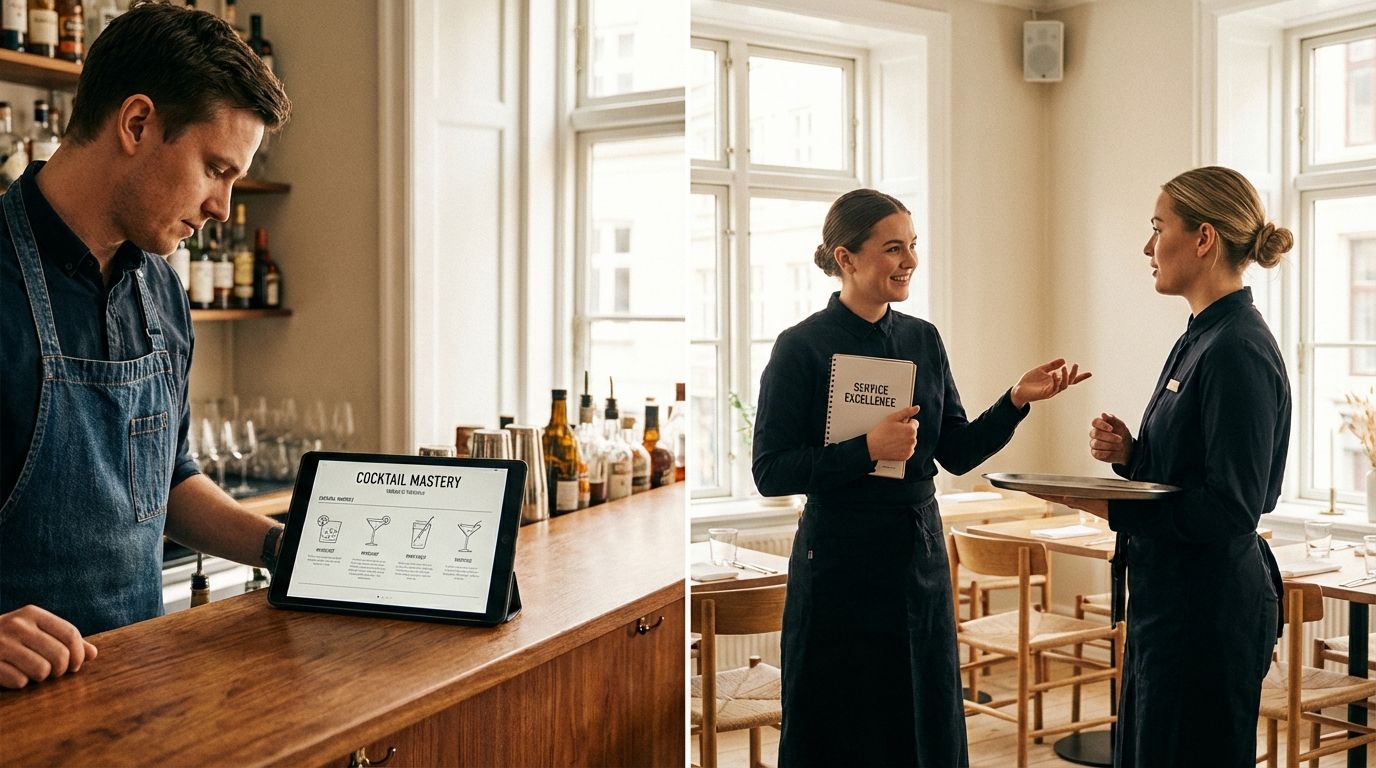 Your bartender reviews cocktail recipes on their phone before Friday night. Kitchen staff refresh food safety protocols between prep tasks.